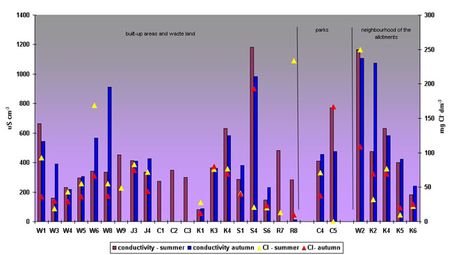The reservoirs located in the urban and built-up watersheds, and amid the waste land, were characterised by the electrolytic conductivity in the range 218 – 665 µ cm-1. Only in S4 the value was extremely high – 1,182 µ cm-1 in the summer and 984 µ cm-1 in the autumn (fig. 2). High values of this parameter (665 and 543 µ cm-1, respectively) were determined also in W1. Both reservoirs are situated near the very busy access roads to Olsztyn. Water in these reservoirs contained also a lot of chloride ions; in S4 as much as 193 mg dm-3.