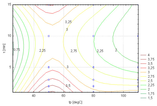 F3q = 2.658 + 0.0208 · tp – 0.1184 · τ – 0.0002 · tp2 – 0.0014 · tp · τ + 0.012 · τ2 (3)
