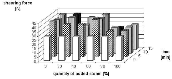 There is significant difference in the values of the shearing force between samples of 80 and 100% steam addition and control sample (without steam addition). It is supposed that just 80 and 100% steam addition exceed loss of water caused and in consequence it causes decrease of the shearing force.