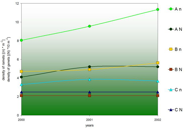 In autumn 1999 for each permanent sample plot a cartogram showing distribution of ramets in a grid of size 0.5 x 0.5 m was made. The development stage of genet, number of vegetative rosettes, and the number and sex of generative shoots were reported during three subsequent growing seasons.