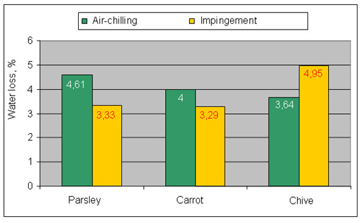 Considering the water losses of products in freezer storage (Fig. 7), it was found out that it was only in case of chive that its higher value characterized the samples frozen by means of impingement. In the other cases, higher values result from air chilling. These differences are significant and they point out that the choice of the proper freezing method has a decisive influence on the quality of the ready product [1,2,4].