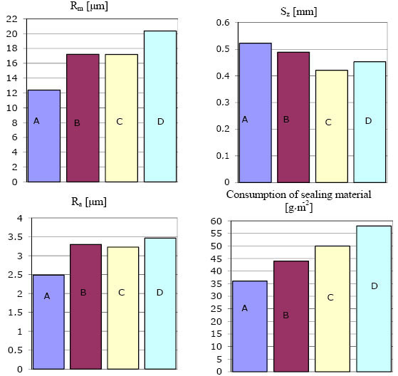The following roughness parameters describing the condition of the board surface were adopted in accordance with the PN-84/D-01005 standard: height parameters – Ra, Rmax, Rz and Rm as well as one distance parameter – Sz (Rz – the average height difference between the 5 highest peaks and the 5 lowest valleys over a single sampling lengh). Entertained roughness parameters was compared in Table 2.