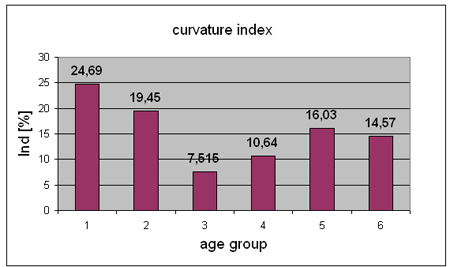 The average curvature index equals 15.48% in whole feotal period and can be interpreted as slightly bent stomach (diagram 5). It was also proved, the lesser curvature grows faster than the greater curvature in 1st, 2nd and 3rd age group (diagram 6). The highest value of the curvature index (24.69%) was observed in the beginnig of foetal period and can be interpreted as sharply bent stomach. In two subsequent groups, the index value decreases in order to reach the lowest value (7.515%) in the third age group (diagram 5). It suggests the stomach becomes slowly slightly bent. In the fifth (16.03%) and sixth (14.57%) age group the curvature index increases one more time (diagram 5).