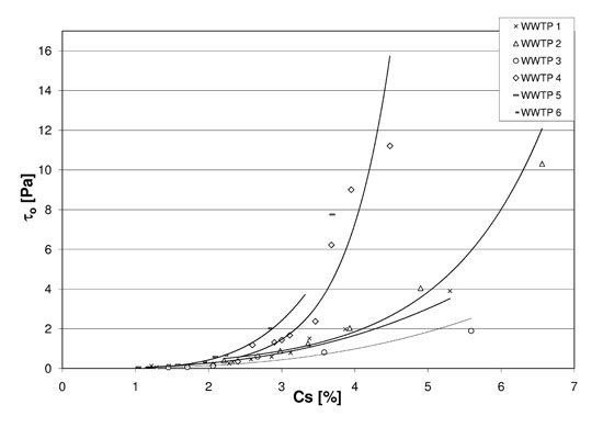 The critical concentration Cs,gr between Newtonian and non-Newtonian behaviour of the sludge was determined by depending on the function tauo(Cs), for tauo = 0 and was calculated using the least squares and power function [2,11,14]. The method is justified by the conversion of the generalised Herschel-Bulkley rheological model to the Newton model. The critical concentration Cs,gr for illustrated series of measurements is from 0.58% (WWTP 6) to 2.41% (WWTP 4).