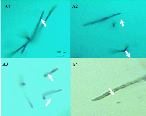 | (A1, A2, A3) these figures illustrate H2O2 staining/occurrence (dark blue-green colour) in the 'saliva deposit' of S.avenae within a-s g incorporating caffeic acid, (+) catechin and L-DOPA, respectively. (A') lack of H2O2 staining in the salivary secretions in presence of 0.005 M PTU, inhibitor of PPO activity. (B1,B2) the blue-green colouring indicated by arrows observed on surface of digestive system showing 'centre' of H2O2 production in the midgut of aphid fed wheat foliage. Results for S.avenae and R.padi, respectively |