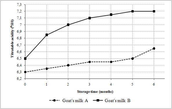 The titratable acidity of both milk samples was found to increase significantly, with higher values observed throughout the storage period for goat's milk originating from producer B.