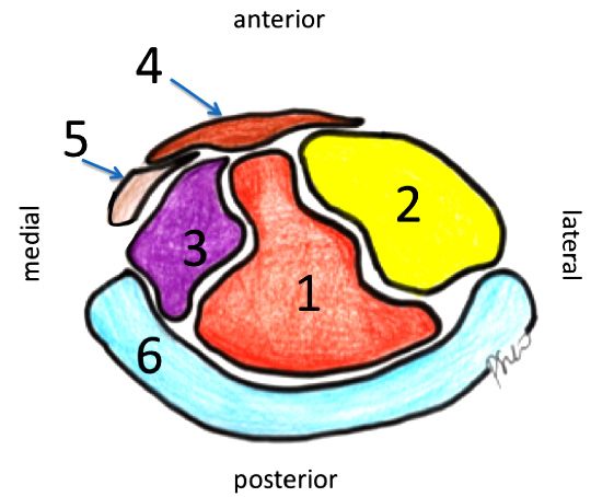 Figure 4. Horizontal cross section through the common calcaneal tendon in horse just above the tuber calcanei. Directions are given on the figure.1-the fascicle of the lateral head of the gastrocnemius muscle, 2-the fascicle of the medial head of the gastrocnemius muscle; 3-the fascicle of the soleus muscle, 4- the tarsal tendon of biceps femoris muscle, 5- the tarsal tendon of semimembranosus muscle, 6- the flexor digitorum superficialis tendon |
