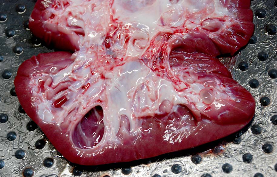| Fig. 1. Necropsy of PKD in the swine. Visible cysts drained from fluid during incision of the kidney and a smaller cyst filled with fluid content |