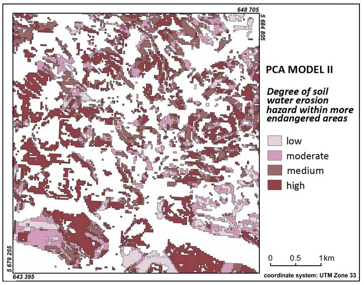 In order to assess soil water erosion hazard in terms of component 3 and component 2 (NDVI), models with different assumptions were created (Tab. 6). PCA Model I, in which component 3 values are negative (low slope and low soil susceptibility), is assumed to indicate areas less endangered with potential soil water erosion risk, whereas PCA Model II with the component 3 values being greater or equal to 0 (i.e. steep slope and high soil susceptibility) demonstrates more endangered areas. In both cases the diversification of actual soil water erosion hazard is a result of component 2 values.