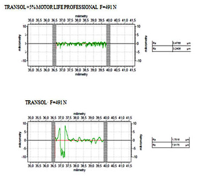 Results of surface roughness measurements show the differences between both lubrication variants in a quantitative form. A reduction in the surface roughness is clearly visible in the case of lubrication with oil with addition of the metal conditioner, both when using the clean oil (see Fig. 3) and the oil containing contaminants (see Fig. 4).
