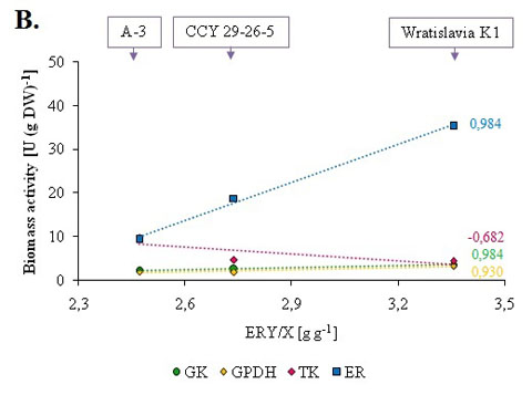 In order to elucidate the effect of activities of the chosen enzymes on erythritol overproduction ability, the obtained results were compared with the amounts of the polyol produced by the yeast cells (Fig. 3). In the yeast growth phase, enzymes activities did not contribute to enhanced erythritol production (Fig. 3A). However, in the effective production phase (Fig. 3B) the cells ability of erythritol formation depended slightly on the GK and GPDH but principally on the ER activity. Moreover, it might be noticed that high overproduction ability shown by Wratislavia K1 strain (Tab. 1) seemed to be correlated with the activity of ER (Tab. 2, Fig. 4) which did not decrease but remained at a high level throughout the cultivation time.
