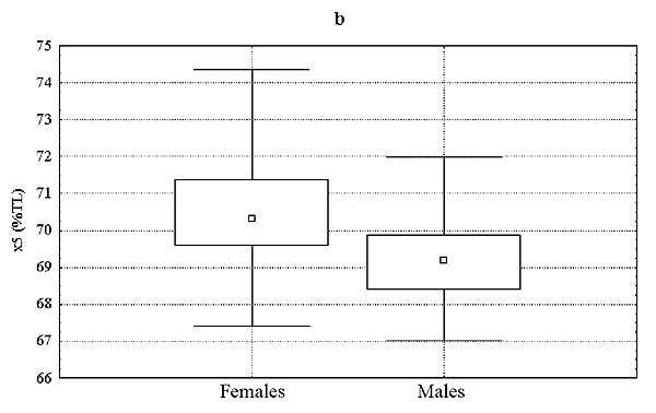 Of all the metric characteristics considered in the 1998 sample, it was the dorsal fin I and II heights (x7 and x8) only that showed high (>10) coefficients of variation, thus displaying a substantial plasticity (Table 3). Coefficients of variation calculated separately for the metric characters of males and females differed (Table 4). In the females, high coefficients of variation were recorded in the dorsal fin I height (x7) and the cloaca opening length (x11). On the other hand, the males were more variable in terms of their body proportions, as high values of V were recorded, in addition to the two character mentioned, also for the dorsal fin II height (x8), eye diameter (x12), caudal fin height (x14), and the distance between gill apertures (x15). On the other hand, the lowest V was recorded in both sexes in the trunk length (x3). Of the numerous non-parametric tests applied, the Wilcoxon and the Mann-Whitney U tests proved suitable for id entifying characters which are most likely to aid in sex determination of the lamprey. Statistically significant between-sexes differences were detected in the following three metric characteristics: the post-dorsal length (x5), body height (x6), and tail length (x10) (Fig. 5).