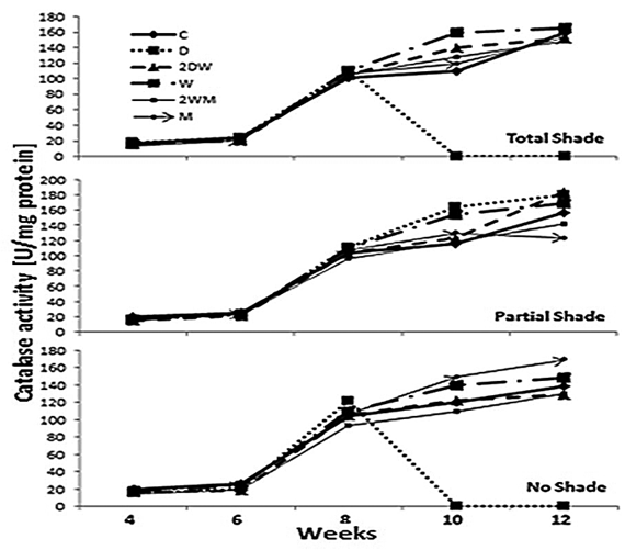 Results showed that SOD concentration in the leaves increased from 0.03 to 0.49 grams per protein in the control under total shade and from 0.01 to 0.56 gram per protein under partial shade; whereas an increase from 0.02 to 0.53 U/mg protein was observed under no shade in the control from 4 weeks to 12 weeks (Fig. 1). At 4 weeks the highest concentration of SOD was 0.08 U/mg protein and it was obtained from 2DW under total shade (0.08 U/mg protein) and M treatment under partial shade (0.08 U/mg protein). For catalase activity lower concentrations of catalase in the leaves of the test plant were obtained at the 4th week (13.83 to 19.56 U/mg protein) under the various experimental conditions (Fig. 2).