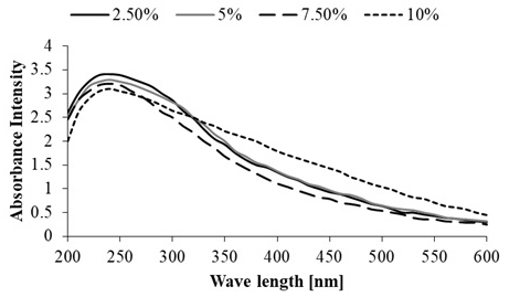 In the UV-VIS spectroscopy analysis, products were scanned with light of wave lengths from 200 nm to 650 nm using a spectrophotometer (PG T80 UV/VIS).