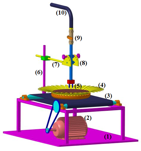 In order to provide the power required for rotating the receptacle, an electromotor (Hummer, MS632-4, Iran) was used. To regulate the rotational velocity of the electromotor and change the rotational direction, a worm gear box (Taizhou Jiao Xing Transmission Equipment Co., Ltd, RV30, China) was used. In order to hold the receptacles during tests, the receptacles were put on a clamping mechanism. The mechanism was constructed in a way that it could hold the receptacle with the diameter of 6 to 360 mm (before fully explained how it works). Angle of impingement was set using changing angle mechanism as it was explained, thoroughly before (in the current study effect of angle of impingement was not examined). To set the rotational velocity of the metal plate, an invertor (LS industrial systems, SV 015ic5-1F, China) was used.