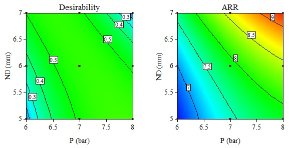 Also, in CR, MR, and SR, the maximum and minimum values of desirability were 0.711 and 0.703, 0.672 and 0.657, and 0.649 and 0.649, respectively. In order to compare more readily, results of interaction effects of ND and P on desirability and predicted ASR of the best point (number 1 in Table 11) in each region are illustrated in Fig. 9. For the second, third, fourth, and fifth points, shape of the contour lines were really same as the first point.