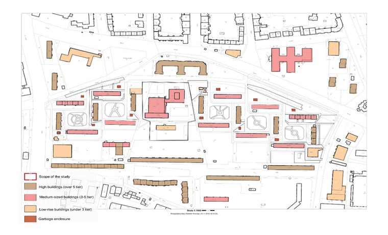 Fig. 3. Spatial analysis of the Szczepin housing complex based on the map of the Board of Geodesy, Cartography and City Cadastre in Wrocław – own elaboration (http://wms.zgkikm.wroc.pl/wms/) |