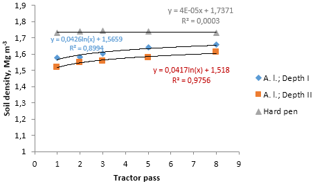 The findings of this study and results published in the literature led to the following conclusions concerning the conditions of experiments. Repeated passes of the tractors with single wheels and with additional wheels caused a linear or non-linear (logarithmic) growth in soil density at the investigated depths in arable layer. Totally only light tractor with dual wheels caused soil density increase in the hard pen. The quantity of the above soil density changes inconsistent depend on the weight tractors and mean tractor pressure. In general, multiple passes of tractors with additional wheels resulted in lower soil density in the arable layer than passes of tractors with single wheels especially by second and third pass. However, this regularity was not always observed in the plough pan.