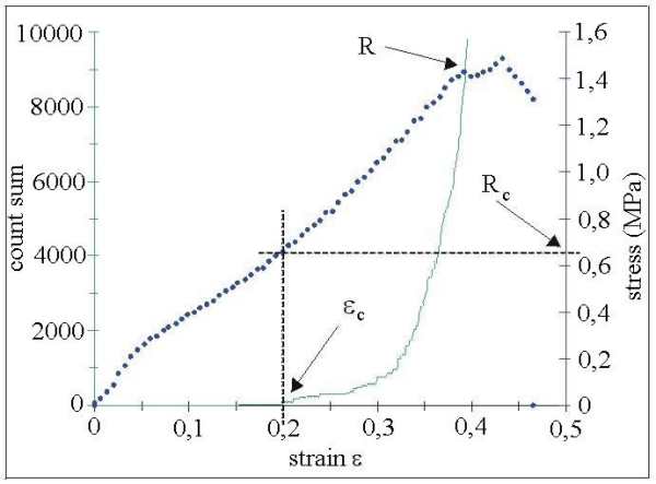 Deformation of the cylindrical sample of potato tuber proved that the counts of the EA signal are recorded at relatively small values of deformation and sample stress when compared to the sample compressive strength R (fig. 5) [5, 6]. The above studies confirm the hypothesis that the processes of plant tissue cracking take place gradually, and the status of sample strength results from a slow propagation of cracks [4]. The structure cracking occurs when stress reaches the strength of some structural elements, e.g. strength of the cell wall. This point on the stress-strain curve corresponds to the first EA counts and can be defined as critical stress Rc and critical strain epsilon c [6].