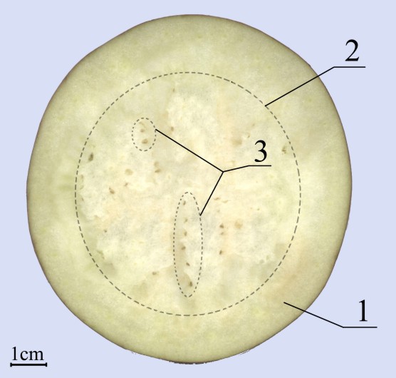 | Fig. 2. Cross-section of eggplant: 1 – sphere of compact flesh, 2 – sphere of spongy flesh, 3 – seed concentration |