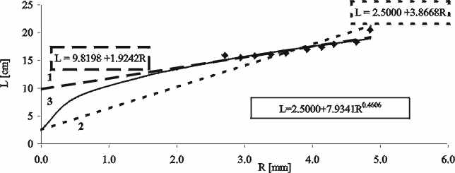 | Fig. 1. Relationship between the perch body length (L) and scale oral radius (R) |