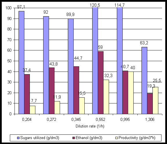 The yields of ethanol was lower than in batch fermentation again. Productivity reached only 6.7 g/dm3*h for Z. mobilis 3883 which was still better then the productivity of another strain. Those relatively low values was connected with fact that the significant wash out of bacterial cells from bioreactor took place. It caused decrease of sugar utilization and ethanol production with growing dilution rate. The results were comparable to those cited in literature (Ishizaki et al. 1994).