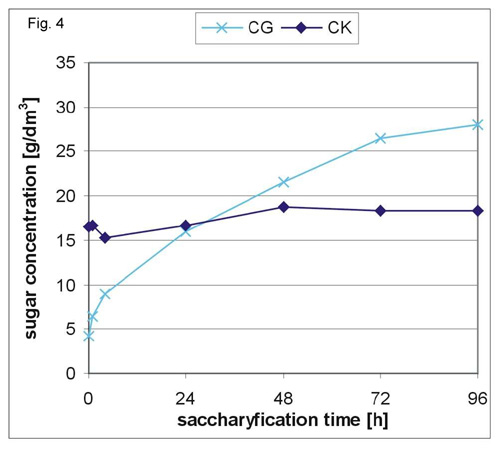 | Fig. 4. Saccharification of wheat straw; CX-xylose conc.; CG-glucose conc. |