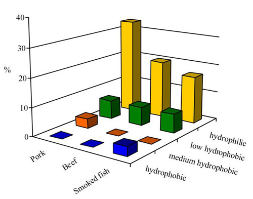 The correlation between hydrophobicity and source of isolates was also analyzed. At 30oC the hydrophilic strains came mainly from pork (33%) whereas only 16.6% was isolated from smoked fish (Fig. 5.)