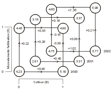 0 – lower level of agronomic factor; 1 – higher level of agronomic factor