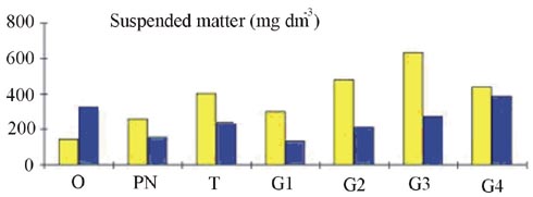 For the total suspended matter, chemical oxygen demand CODMn, ammonia nitrogen and phosphates during 3 years of study the statistical calculations were performed (Table 4). As the employed NIR test (the least significant differences) displayed for the total suspended matter and chemical oxygen demand CODMn differences between September and November were statistically significant at the level α<0.05.