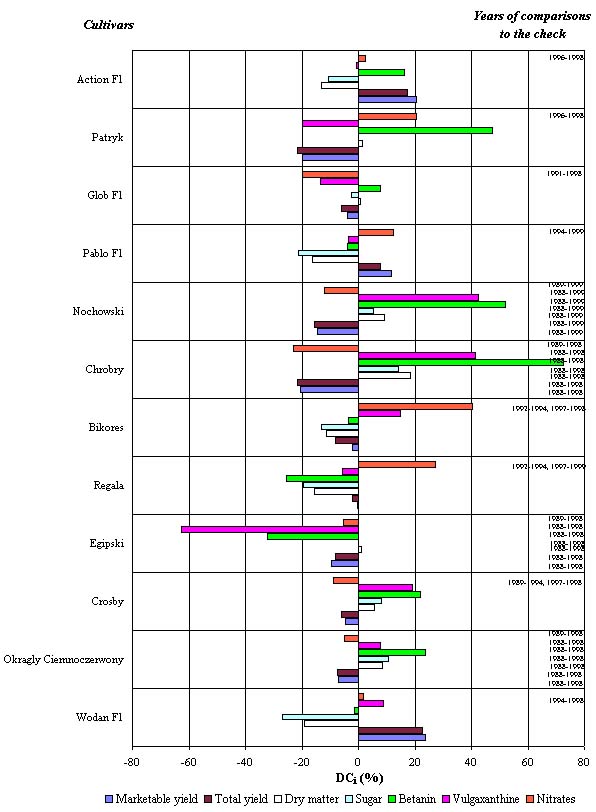 Introduction of three Polish and three foreign cultivars to a set of three older cultivars (Okr±gły Ciemnoczerwony, Crosby and Egipski) brought about the changes of the genetic potential. Among the cultivars included in the analyses, a cultivar owned by Bejo Zaden B.V. contributed most of all to the increase in yield and cultivars coming from SPÓJNIA Hodowla Ro¶lin i Nasiennictwo Ogrodnicze Sp. z o.o. displayed the highest content of dry matter, sugar, pigments and the lowest – of nitrates (fig. 2).