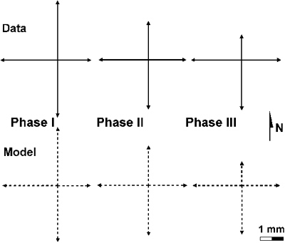 The annual averages of the NESW thickness growths for the identified I, II, and III Phases both for the real and the modeled data are set in Table 1.