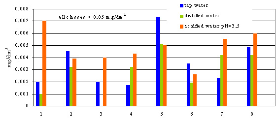 Applying low reaction water for leaching proved the expected higher heavy metal contents, in relation to running water levels, in post-leaching water true. Despite a distinct increase in metal concentrations, the water quality class remained at class I level. It should be highlighted here, that for leaching the material with acidified water, solely water reaction and concentrations of heavy metals were examined. Neither the amount of sulphates, chlorides. nor other elements were determined, since their concentrations in acidified waters tend to be similar, while heavy metals become ionised and are susceptible to being leached out.