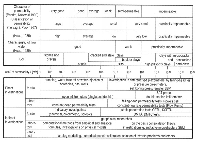 Experimental methods of the research are more accurate. The determination of permeability parameters of soils in an experimental way, however, constitutes a complicated problem because the permeability coefficient depends on many factors simultaneously existing during testing. The water flow through a soil, and thus the permeability coefficient, depends, to a large extent, on the structure of soil where this flow occurs. The most essential is quality of pores in the soil (their size and shape). Moreover, in coherent soils it is necessary to use considerable pressure to defeat the resistance of molecular forces and to begin movement of water. Mechanics of the water flow through a porous medium - like a soil - has already been well recognized and described. However, there is lack of well elaborated and standarized methodologies of the research. The most important thing in the methodology itself is the scale of a solved issue and the range of applied hydraulic gradients which are directly connected with the regime of moving water.