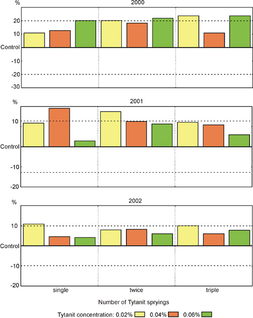 Over the successive research years a significant increase in the seed yield was recorded following the application of 0.06% Tytanit after a single, double and triple plant spraying in 2000, 0.04% - after a single and 0.02% - after two treatments in 2001 and 0.02% - after a single and triple spraying in 2002 (Fig. 2).