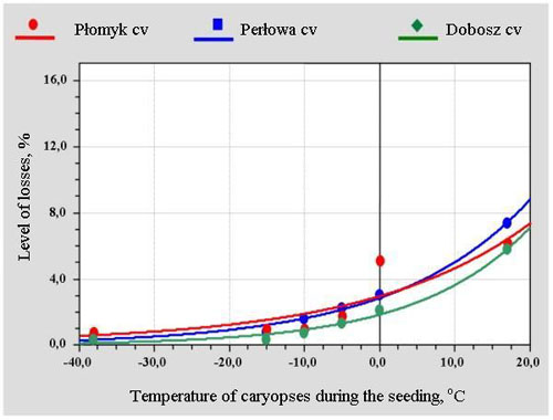 Regression relations were determined using the model of exponential fitting. The best fitting to the experimental results was obtained every time by means of the equation y = aebx (tab. 7), where “y” was the start level, and “x” described the temperature of the seeds during the seeding process.