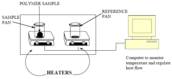 This device consists of two pans. In one pan, the polymer sample is loaded. The other pan is the reference pan and is normally left empty. These two pans are located on top of a heater. The computer assembly will turn on the heaters and the heating rates (q*t-1) of the two pans are accurately controlled (about 10 °C per minute). The computer programs the heating rate to stay exactly the same through out the experiment. It is also important to note that the two separate pans, with their heaters are heated at the same rate as each other [19].