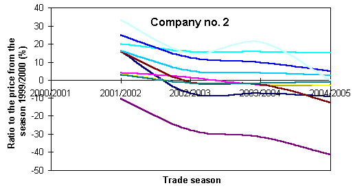 The analysis of the price strategies of seed companies in the trade seasons from 1999/2000 to 2004/2005 also showed that the real price of retail seed bags went down or did not change (Fig. 5). Despite the fact that a common amongst seed companies opinion that seeds are too cheap, the companies were using price as a basic tool for combating competition. This was especially well seen on the amateurs’ market in the case of small seed companies4.