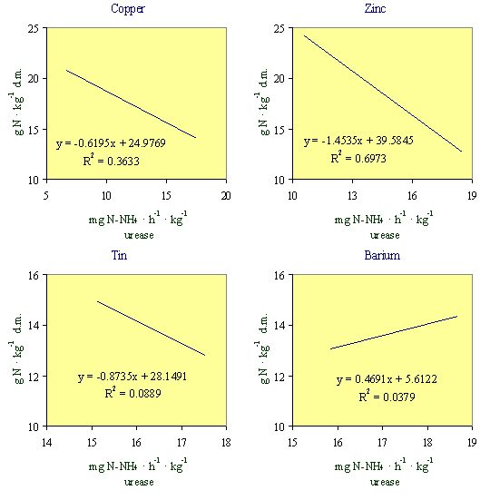 | Fig.1. Relationships between the urease activity in soil contaminated with Cu, Zn, Sn or Ba and nitrogen content in above-ground parts of spring barley |