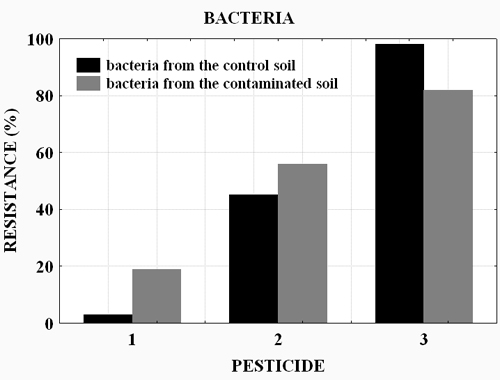 In that way 10 results were obtained (the size for 10 pairs of strains originating from the soil contaminated with a specific pesticide). These 10 obtained values (%) provided data for one an average value, which corresponded to the resistance percentage of a studied pesticide.