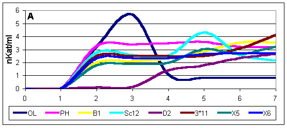 The dynamics of xylanases expression was studied using SZW medium, as more natural medium (Fig. 5). Generally on 7th day of culture, the activity of xylanases was higher that the ones achieved on mineral media (Fig 3, Fig. 4, Fig 5). Except of the strain OL, which after 3rd of day cultivation reached maximal level of their biosynthesis, the activities of the remaining 7 strains after second day of cultivation were on equal level.